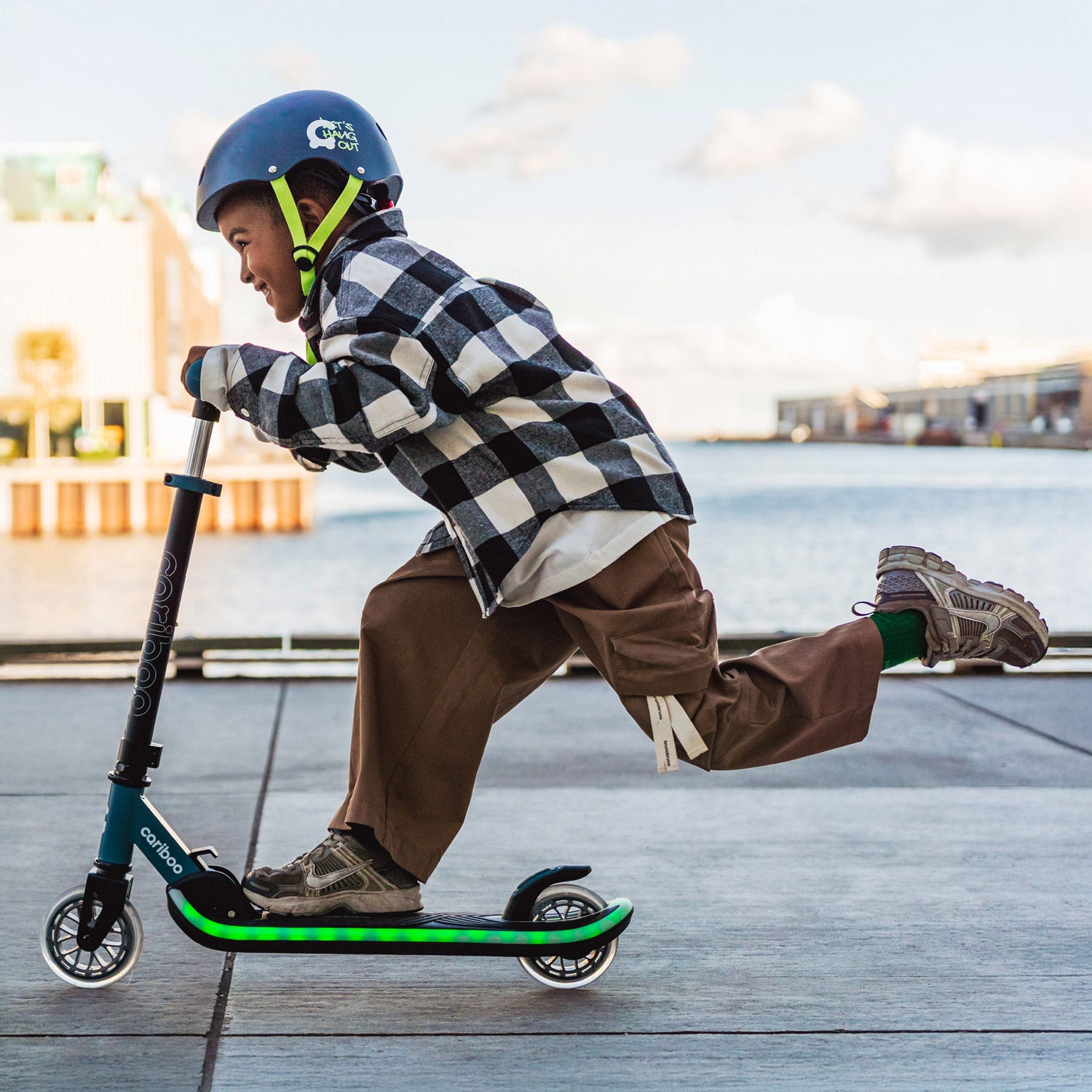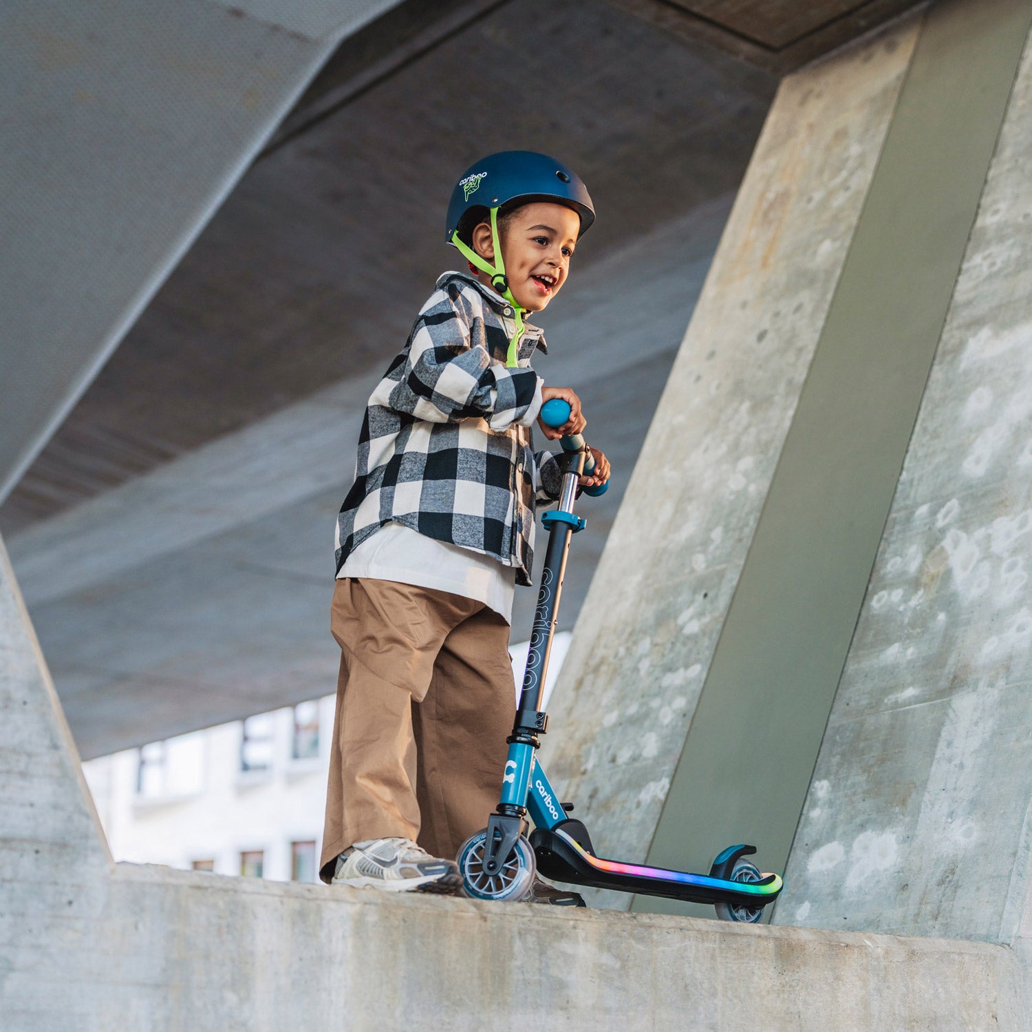 LEDStar is a scooter that you can light up with a single button. The control button on the handlebars allows the child to instantly change the lighting modes – from turning them on to dynamic light effects. Everything happens without stopping and without adult help – it's simply within reach.