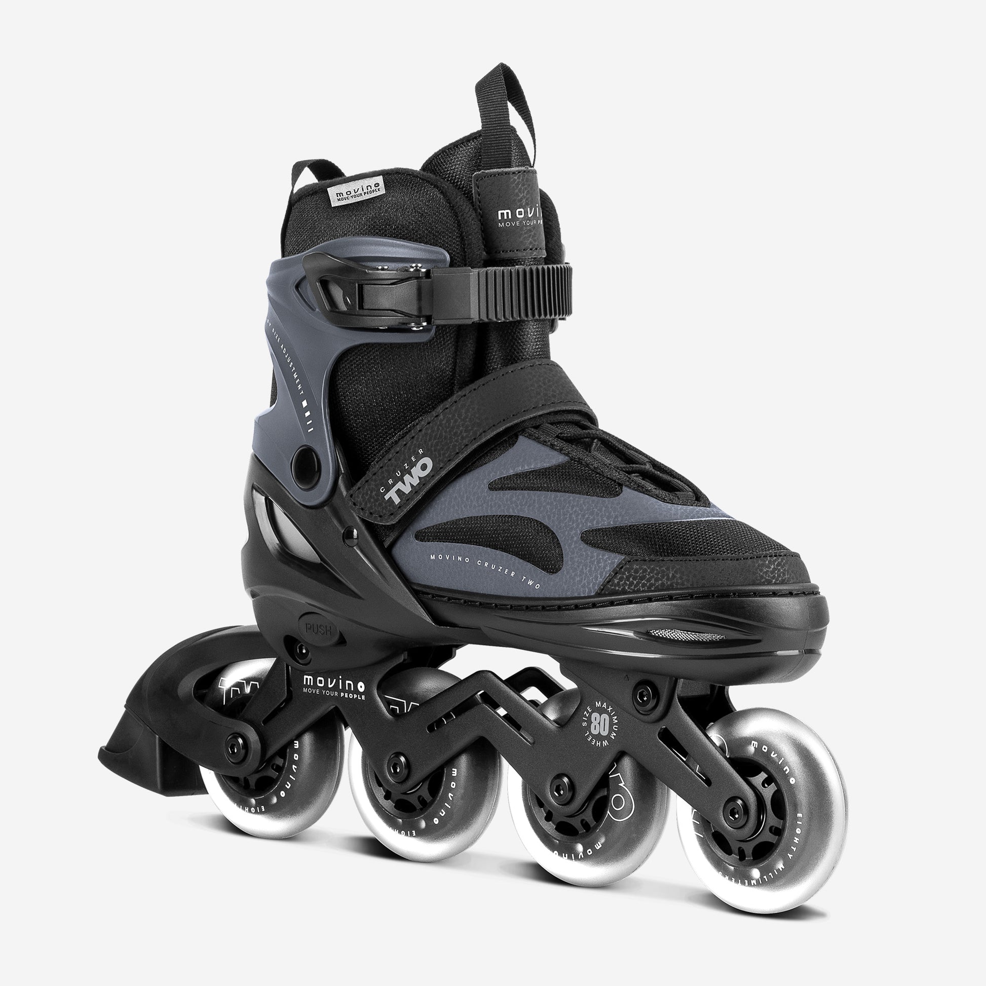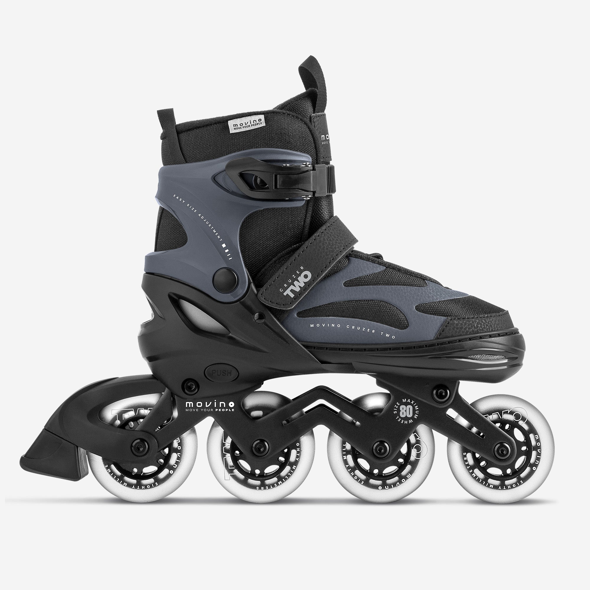 Eenvoudige Maatverstelling De Movino Cruzer Two is ontworpen voor jarenlang skateplezier. Met het snelle en handige 4-staps verstelsysteem stel je eenvoudig de perfecte schoenlengte in. Maak simpelweg de klittenbandsluiting los en druk op de "PUSH"-knop.